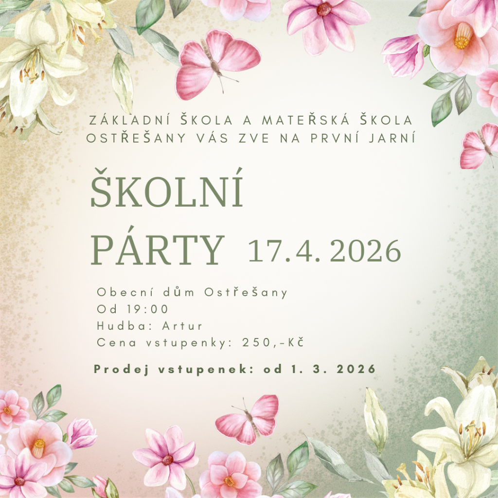 Milí rodiče, prarodiče, milí spoluobčané. Rádi bychom Vás pozvali na jarní školní a školkovou párty, která se uskuteční 17. 4. 2026 v OD Ostřešany. Zahraje hudební skupina Artur. Dress code: především pohodlný. Těšíme se na Vás!